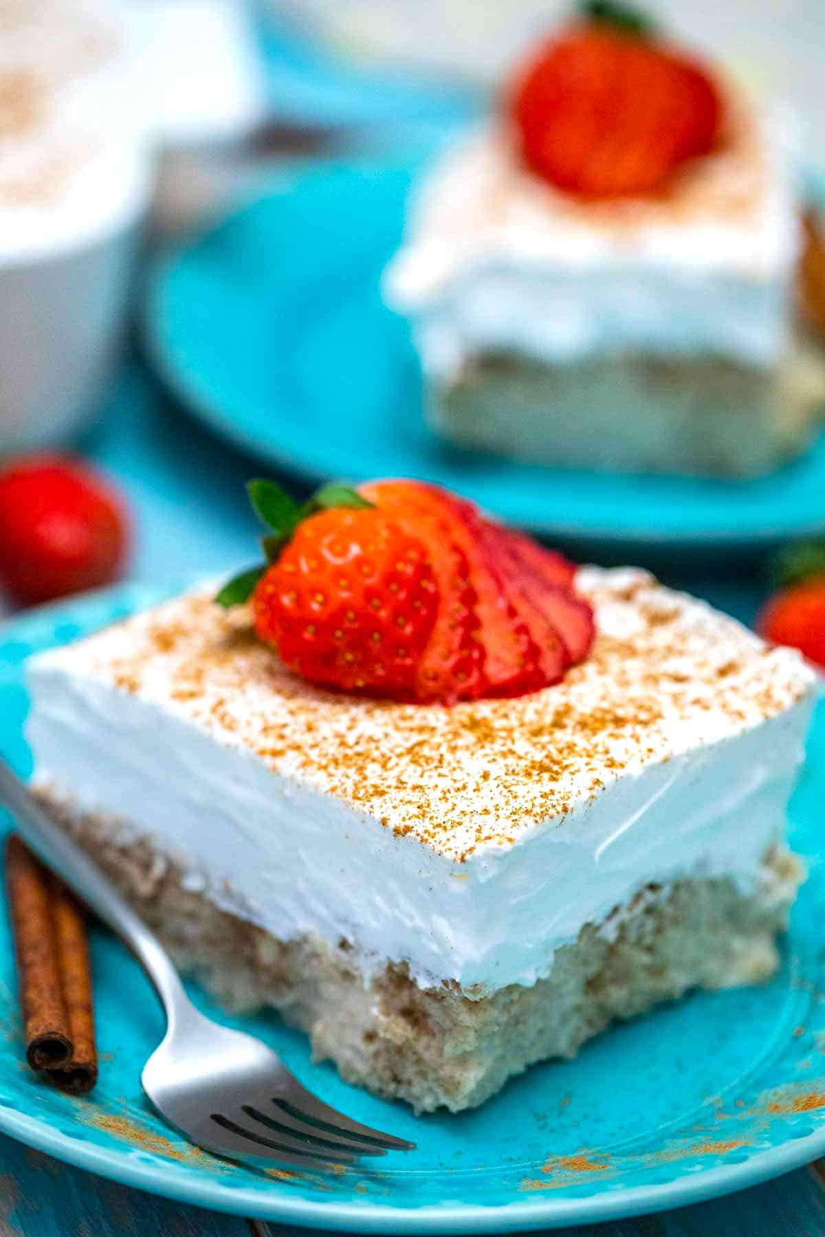 Tres Leches Cake is a light, fluffy, creamy poke cake soaked in a mixture of three kinds of milk, topped with whipped cream and fresh berries.