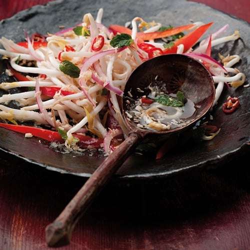 - To assemble the salad, add the red pepper, bean sprouts, red chili, and mint to the onion mixture, and toss until all the ingredients are well coated. Transfer to a serving bowl, scatter the toasted coconut over the top, and serve immediately.
