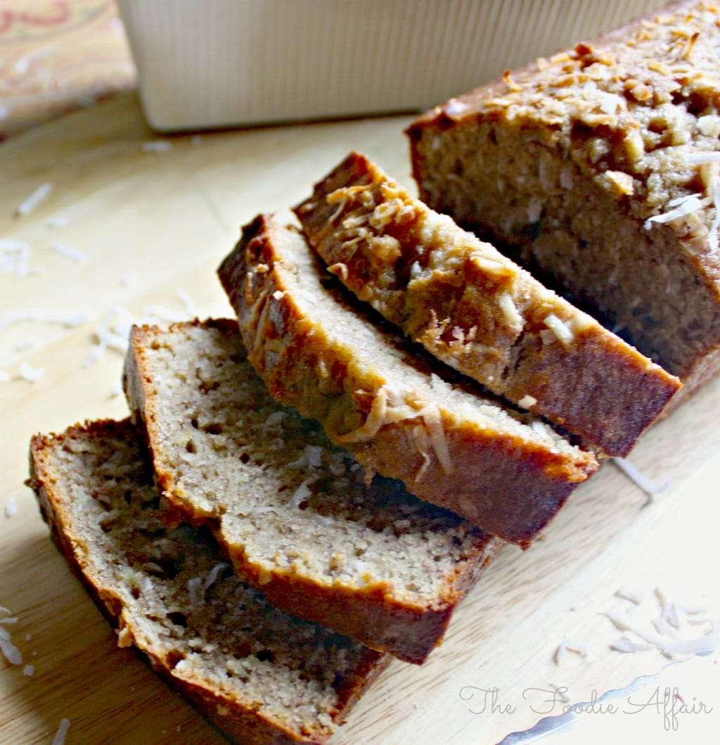 Moist and tender banana quick bread with a tropical twist. Coconut and dark rum add a delicious layer of flavor to the bread.