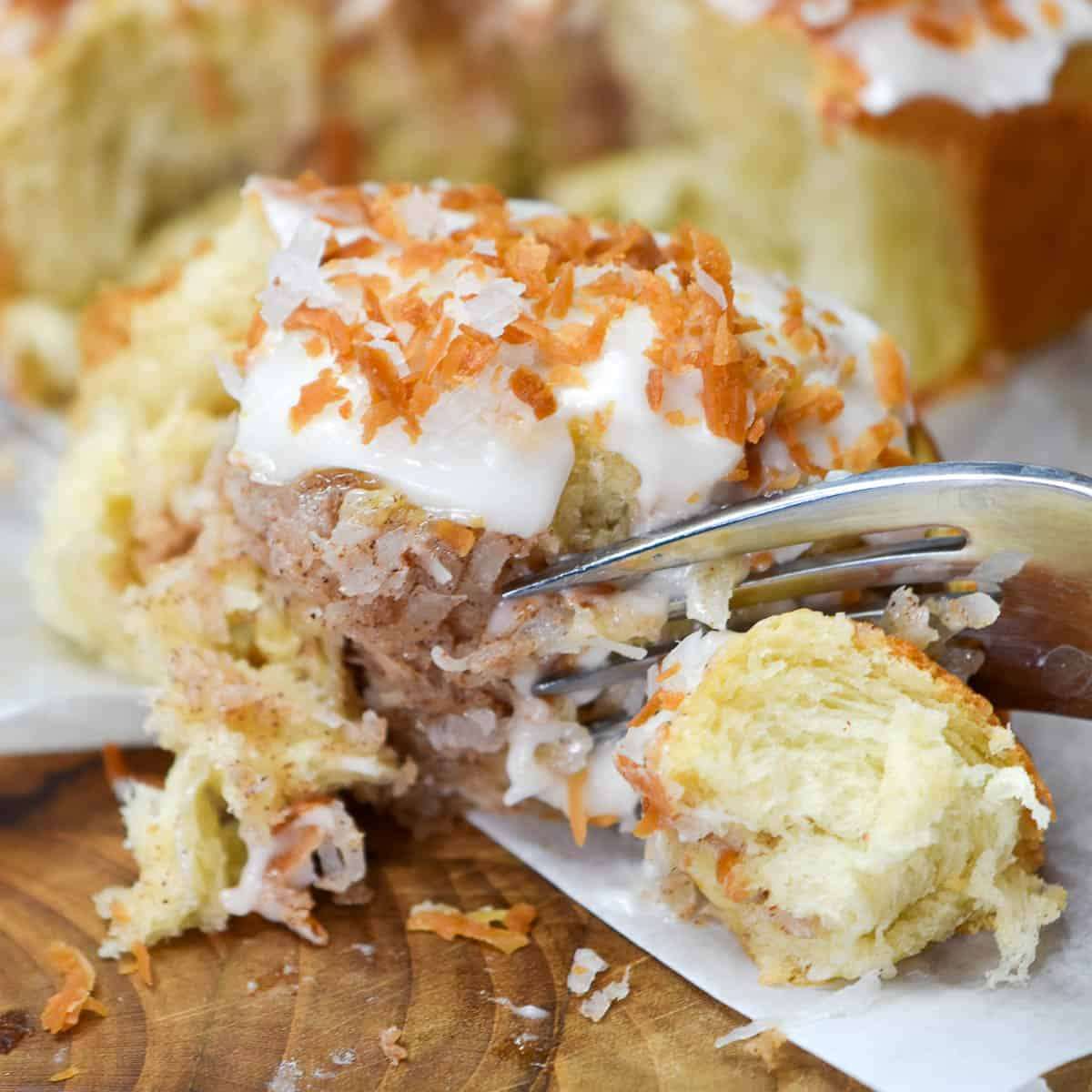 Decadent and soft coconut cinnamon rolls with a spiced coconut almond macaroon filling. Topped with cream cheese frosting and toasted coconut.