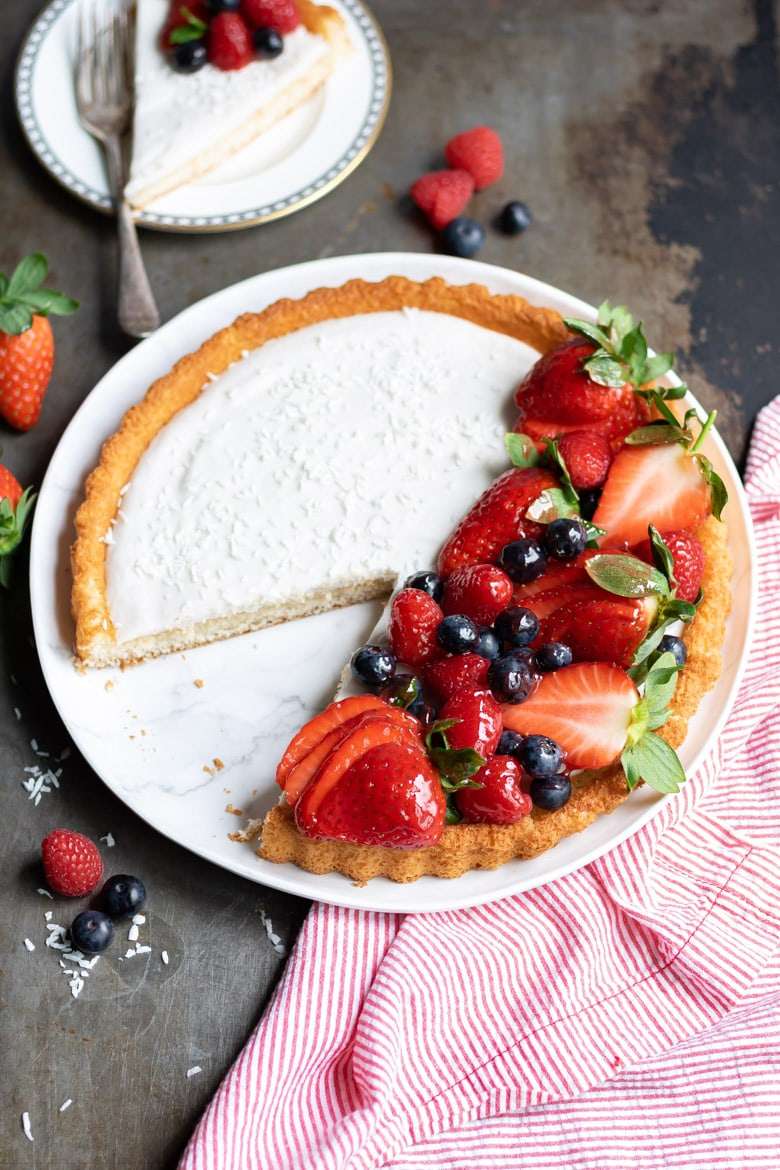 - Meanwhile, add the fruit to the chilled tart decoratively. Brush the fruit with the glaze, taking care not to disturb the fruit. Sprinkle with coconut. Keep in the fridge until ready to serve.