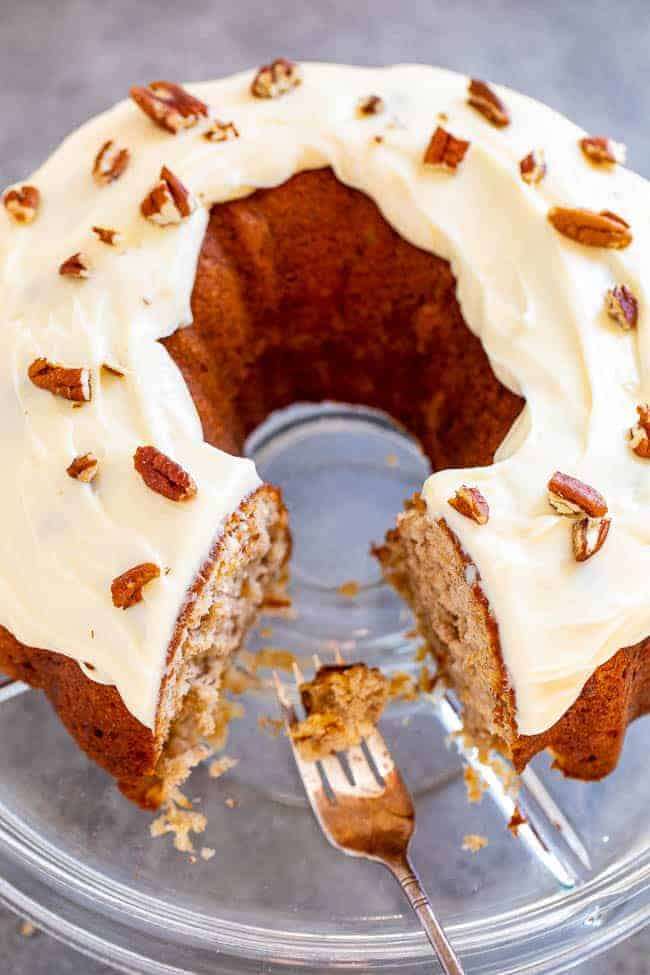 - Preheat oven to 350F and spray a 14-cup Bundt pan very well with floured cooking spray; or grease and flour the pan. See Note 1 below about pan options and considerations. Unless you have a huge 14-cup Bundt pan, you will likely need to bake some of the additional batter in a loaf pan or make three 9-inch round cakes. Read the Note in detail.