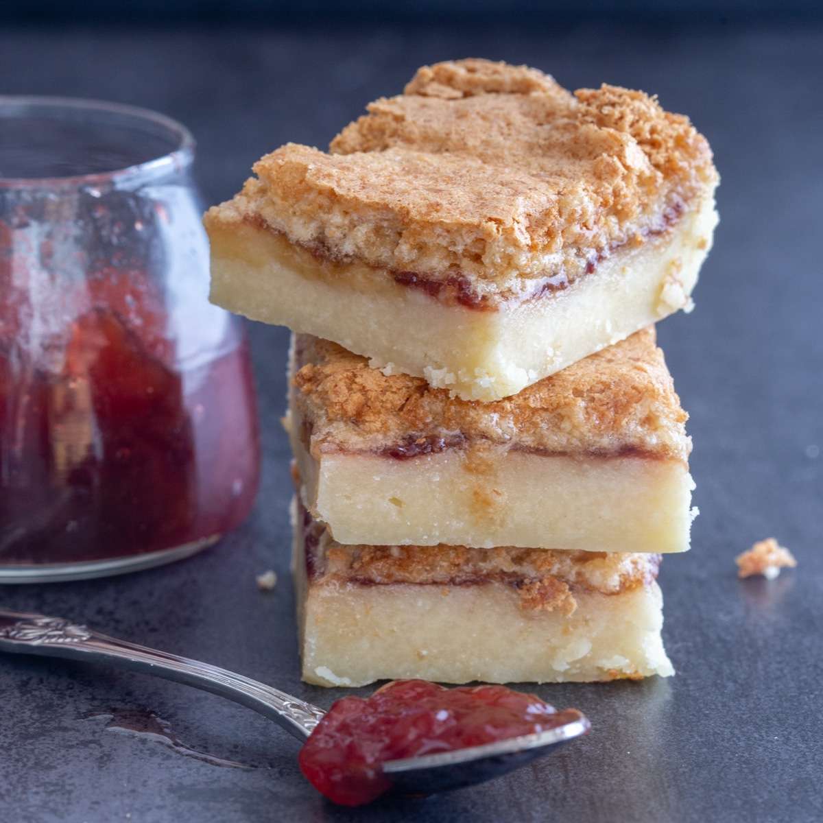 - In a medium bowl cream the butter (beat approximately 1-2 minutes), add the sugar and combine well at medium speed, gradually add the flour mixture, when well mixed, spread and pack lightly in the prepared pan. Thinly spread the base with the jam. Cover with the topping and bake in the pre-heated oven for approximately 35 minutes. Cut into small squares when cool. Enjoy!