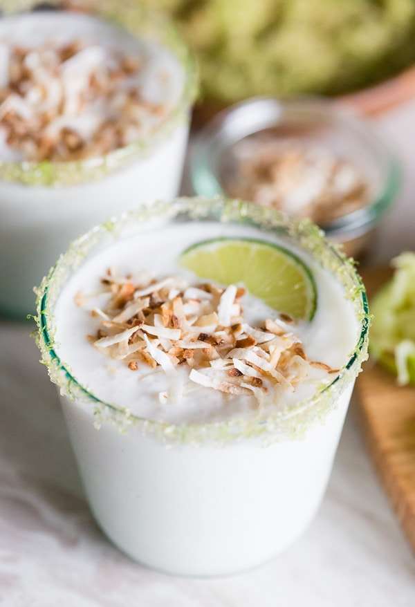 This coconut lime frozen margarita is just what your summer ordered! PACKED full of sweet coconut flavor and jazzed up with zippy lime juice. Instead of salt, I opted to rim the cocktail with lime sugar and top it with toasted coconut.