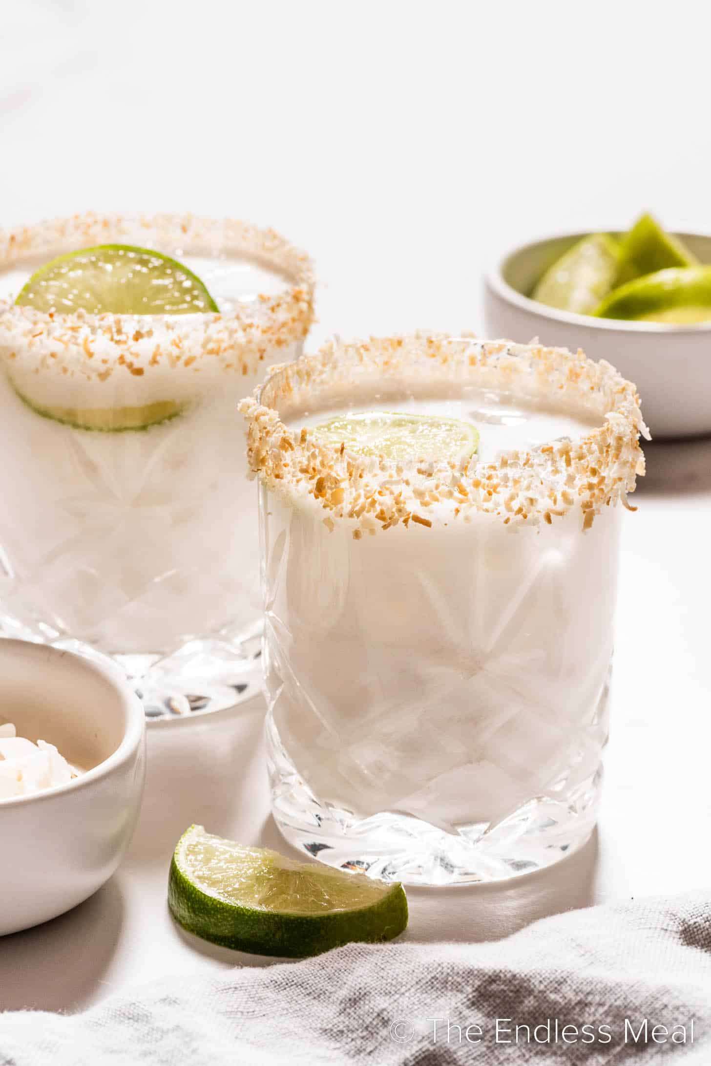 - Strain your coconut margarita into the glass and garnish with a slice of lime.