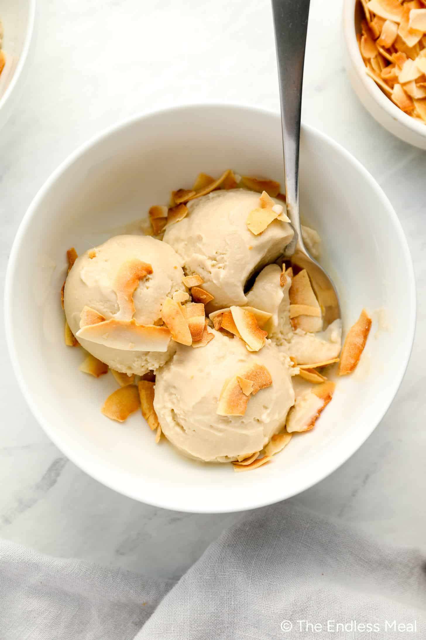 - Scoop the ice cream into bowls and serve with some toasted shredded coconut on top.