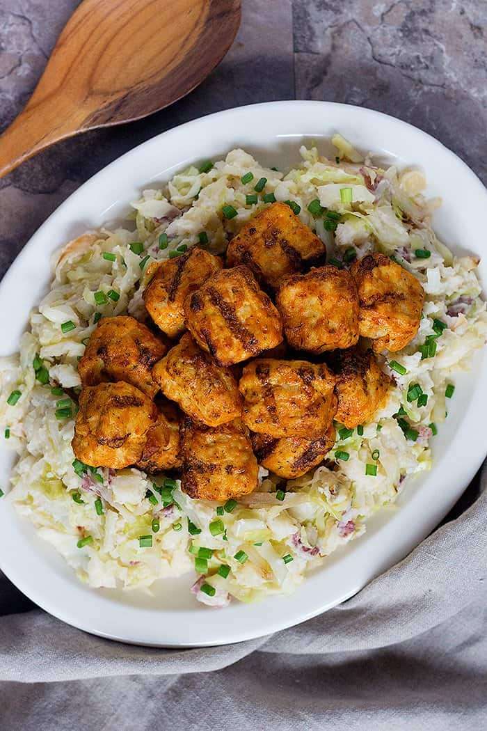 - Prepare Cooked Perfect Fire Grilled Chunks Buffalo Ranch according to the packaging. Serve with Colcannon Mash.