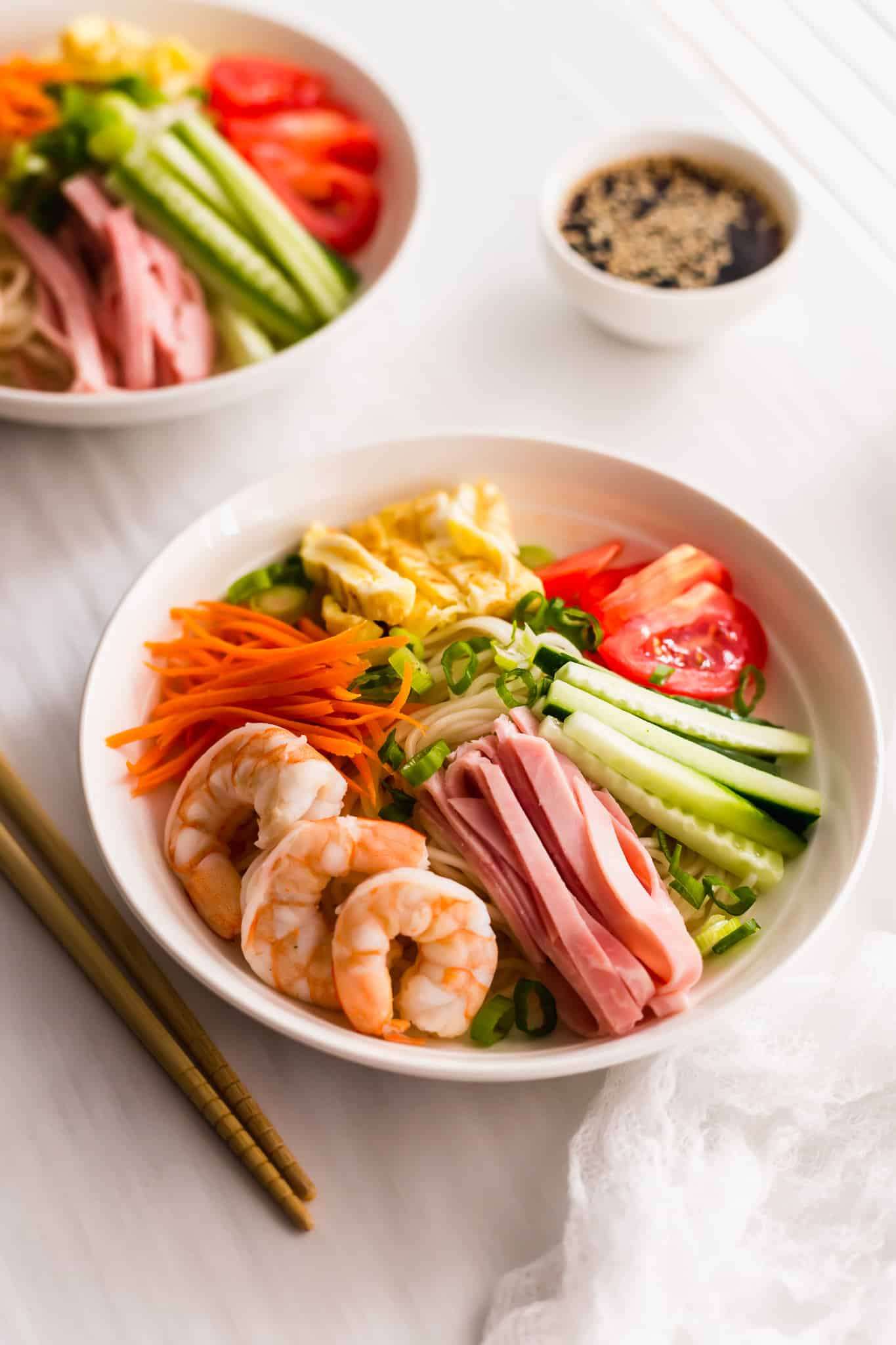 - When ready to serve, portion the cold noodles into bowls and arrange the eggs, ham/meat, cucumber, carrot, tomato, shrimp (and whatever toppings) over top the noodles. Pour the sauce over the noodles, mix well and enjoy immediately.