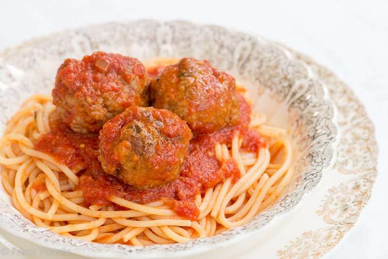 - Cook the spaghetti al dente and drain well. Dress lightly with the tomato sauce. Plate the spaghetti and top with some more sauce and 2-3 meatballs. Top with freshly grated Parmesan or pecorino romano cheese, if you like, and enjoy!