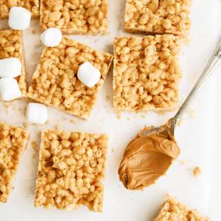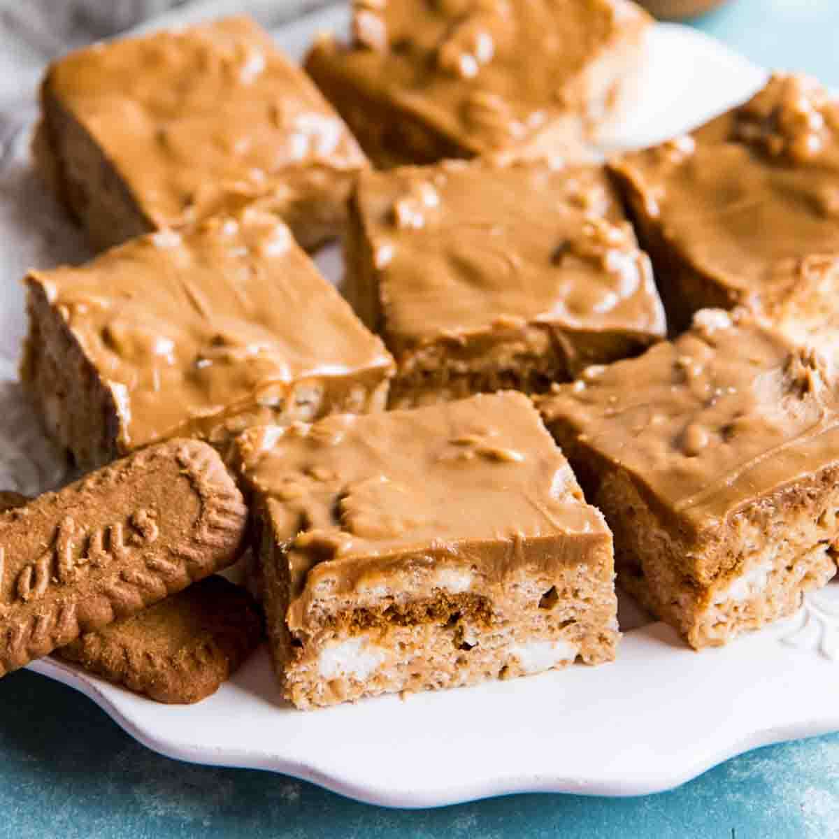 These Cookie Butter Rice Krispie Treats take a simple, basic rice krispie treat to a whole other level with actual chunks of Biscoff cookies and cookie butter mixed into the marshmallow rice krispie base, and a layer of cookie butter glaze over the top!