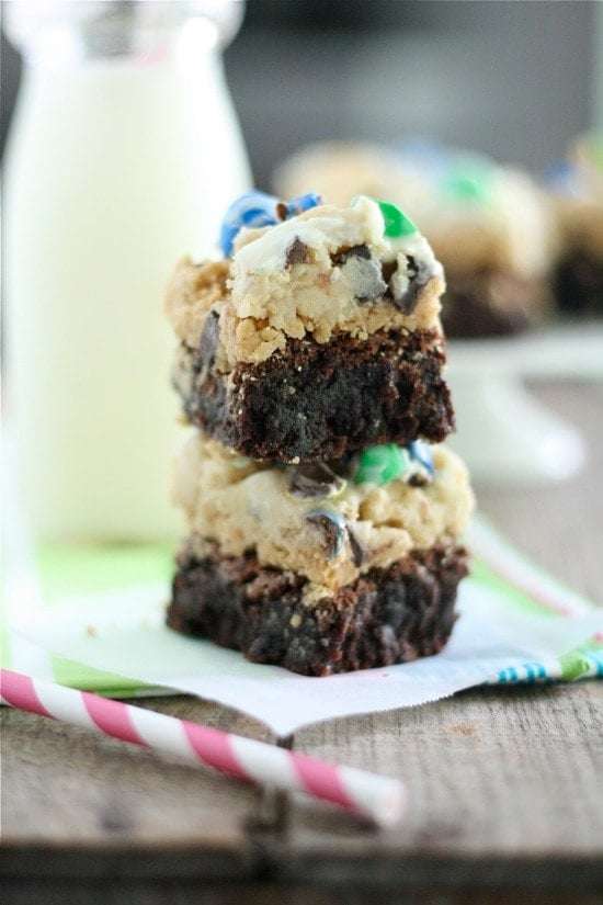 These Cookie Dough Brownies are topped with all of your favorite things! Peanut butter, oatmeal chocolate chip cookie dough, and M&M's! What could be better?