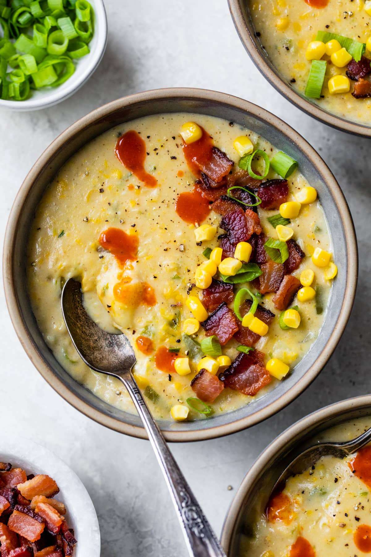 The best creamy corn chowder loaded with bacon, tender potatoes, and sweet corn. Easy and hearty, it's a perfect meal.