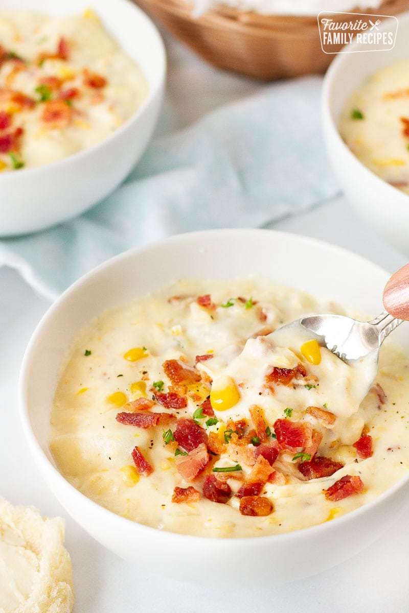 Corn chowder is a rich, hearty soup that will warm you from head to toe. The bacon in this chowder adds a delicious flavor to the corn and potatoes. Kids and adults love it!
