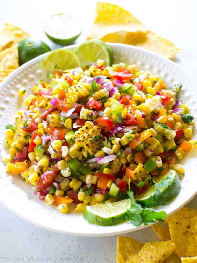 Corn Salsa is a fresh corn salad with tomatoes, onion, bell peppers, jalapeno, and cilantro. Add a squeeze of lime and you're done! This is the best corn salsa and is a healthy side dish!