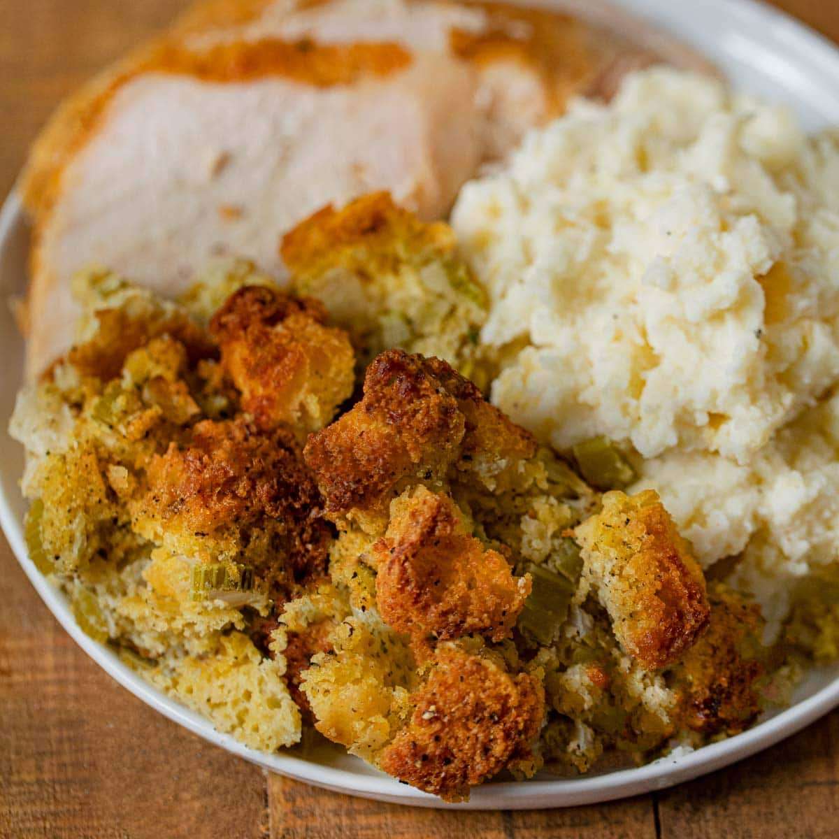 Southern Cornbread Dressing is a classic Thanksgiving dinner side dish. Easy stuffing recipe with homemade cornbread, onion, celery, and poultry seasoning.
