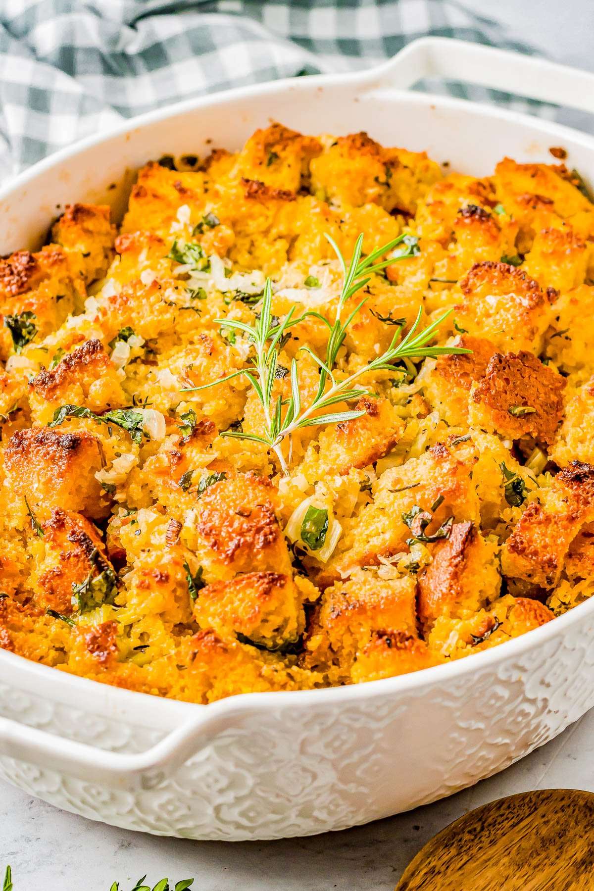 Fast and easy homemade cornbread is transformed into a family favorite cornbread stuffing side dish with the addition of celery, onions, garlic, broth, and a bouquet of fresh herbs! Soft, tender, EASY, and sure to become a hit at your Thanksgiving and Christmas holiday celebrations! 🧡💛🙌