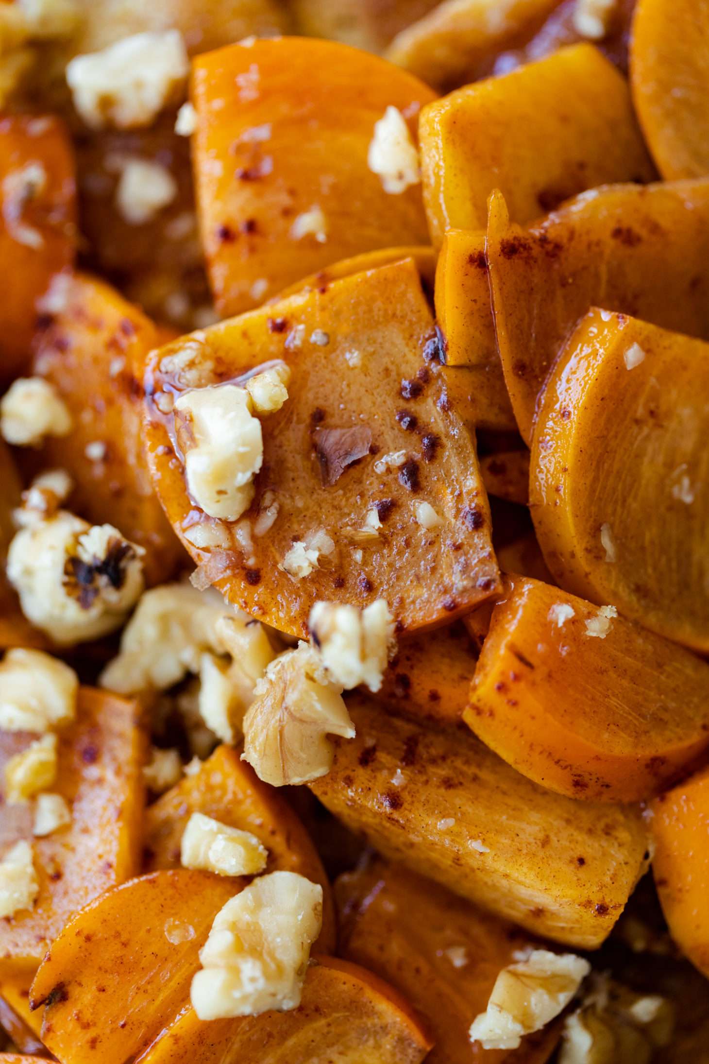 - To finish the pancakes, top with the persimmons, a sprinkle of the toasted walnuts, and a sprinkle of cinnamon.