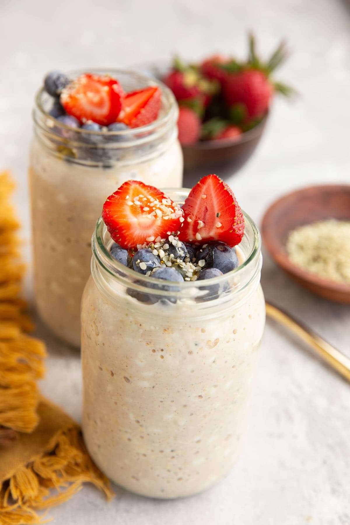 - Enjoy cottage cheese overnight oats with your favorite mix-ins or toppings. I go with fresh fruit such as blueberries, strawberries, or sliced banana, honey, and a sprinkle of nuts or granola. Add almond butter or nut butter of choice for some healthy fats. Go heavy on the blueberries for a great source of dietary fiber, or add some Greek yogurt for extra protein.
