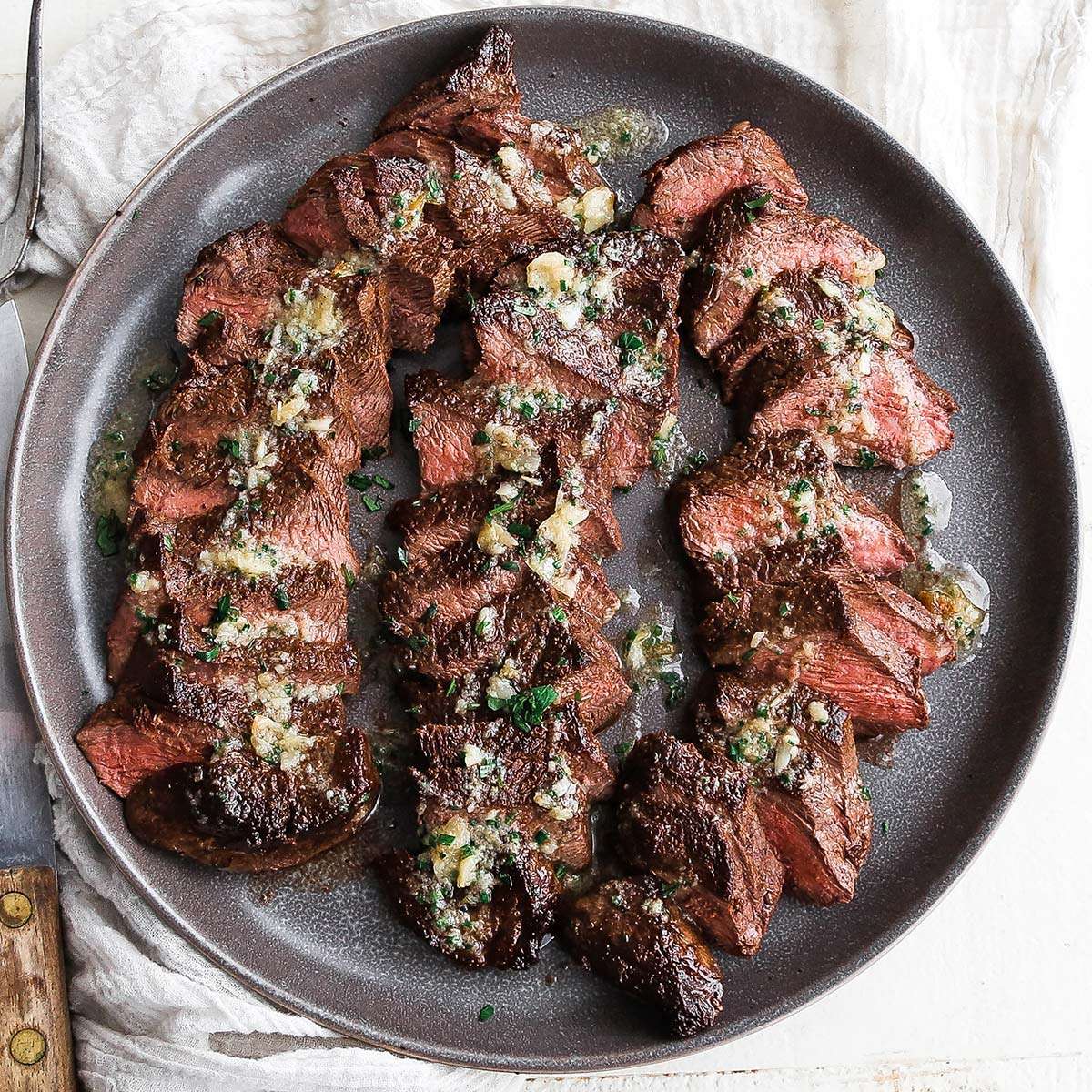 - I like to Slice the steaks thin and, on a bias, serve it with optional roasted garlic butter.