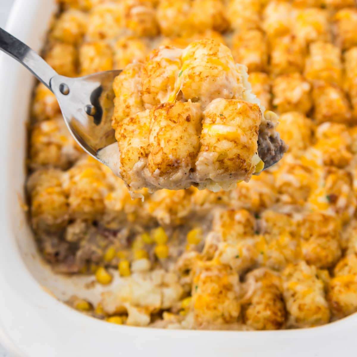 - Bake for 40 minutes; until bubbly and tots are browned. Then top with remaining ½ cup cheese and bake until melted; about 5 minutes.