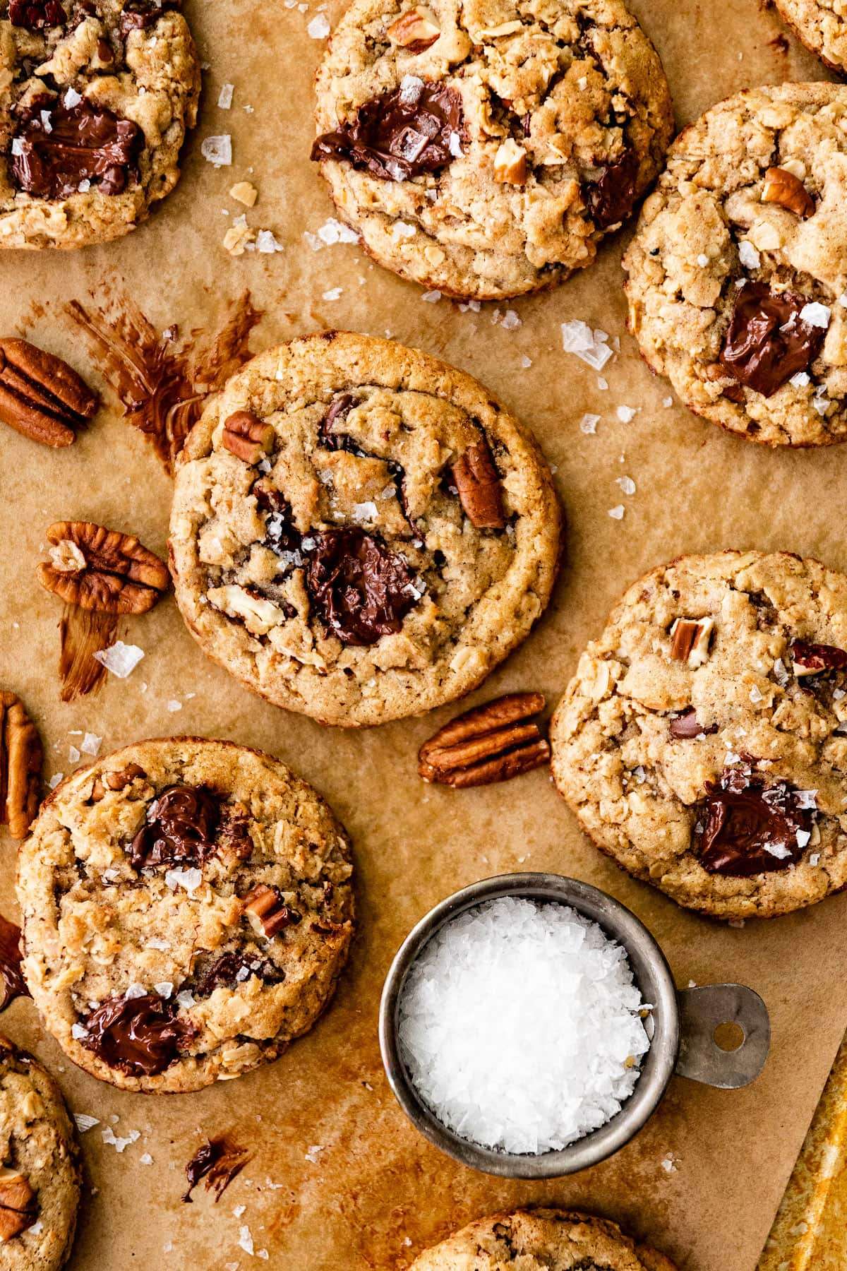 Hearty oatmeal cookies made with brown butter, pecans, toasted coconut, and chocolate chips! This is the BEST Cowboy cookie recipe! Your friends and family will LOVE them!