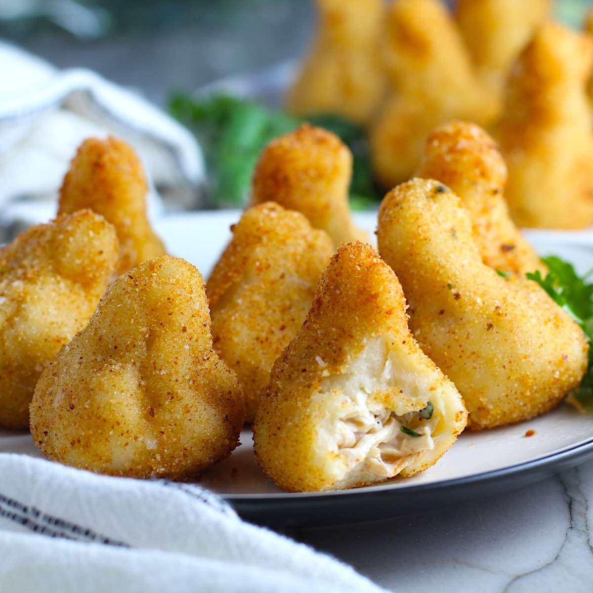 Brazilian Coxinha are Chicken Croquettes that are crunchy on the outside, soft and creamy on the inside. They are a traditional savory pastry item that you see all over Brazil. These have a savory chicken, and cheese filling with onion, garlic, cilantro, jalapeno and more! The flavor is amazing! The filling is wrapped in pastry dough, then breaded and fried until golden brown, crispy, and crunchy.