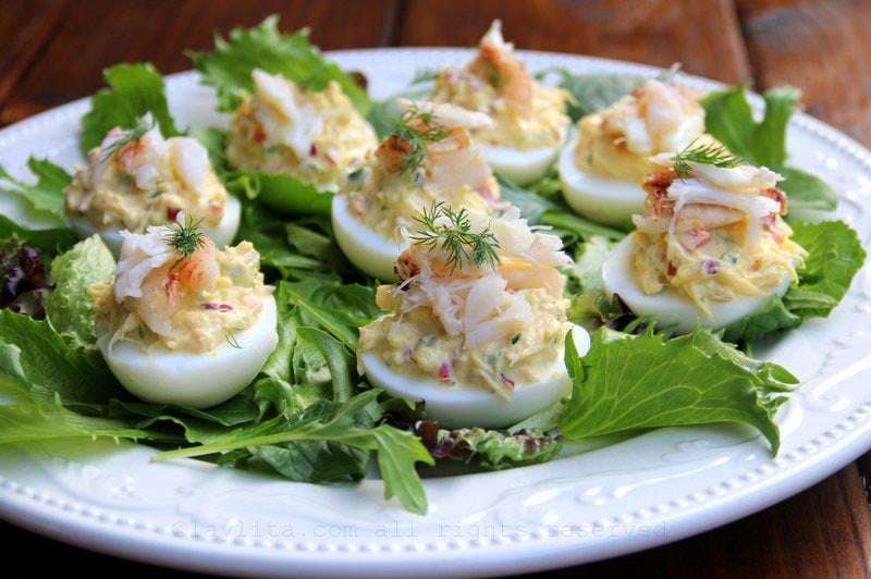 - Garnish the deviled eggs with the cooked crab meat and fresh herbs. Place the crab salad stuffed deviled eggs on greens or lettuce to serve.