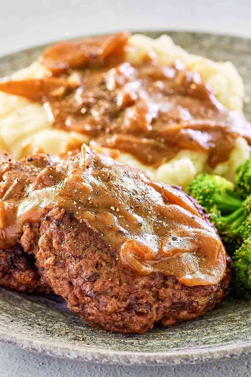 - Place the hamburger steaks on a plate and top with onions and gravy.