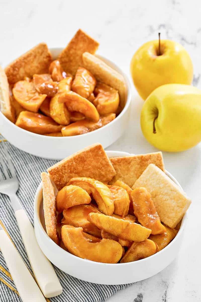 - To assemble, divide the apples into 4 small serving dishes and drizzle with caramel. Place 4 pieces of pie crust around the apples in each dish and serve.