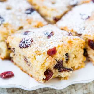 - In a separate bowl combine the flour, baking powder, salt and cinnamon; stir well to combine. Add flour mixture to butter mixture, whisking the two together *just until combined. Stir in cranberries and white chocolate (batter will be VERY thick).
