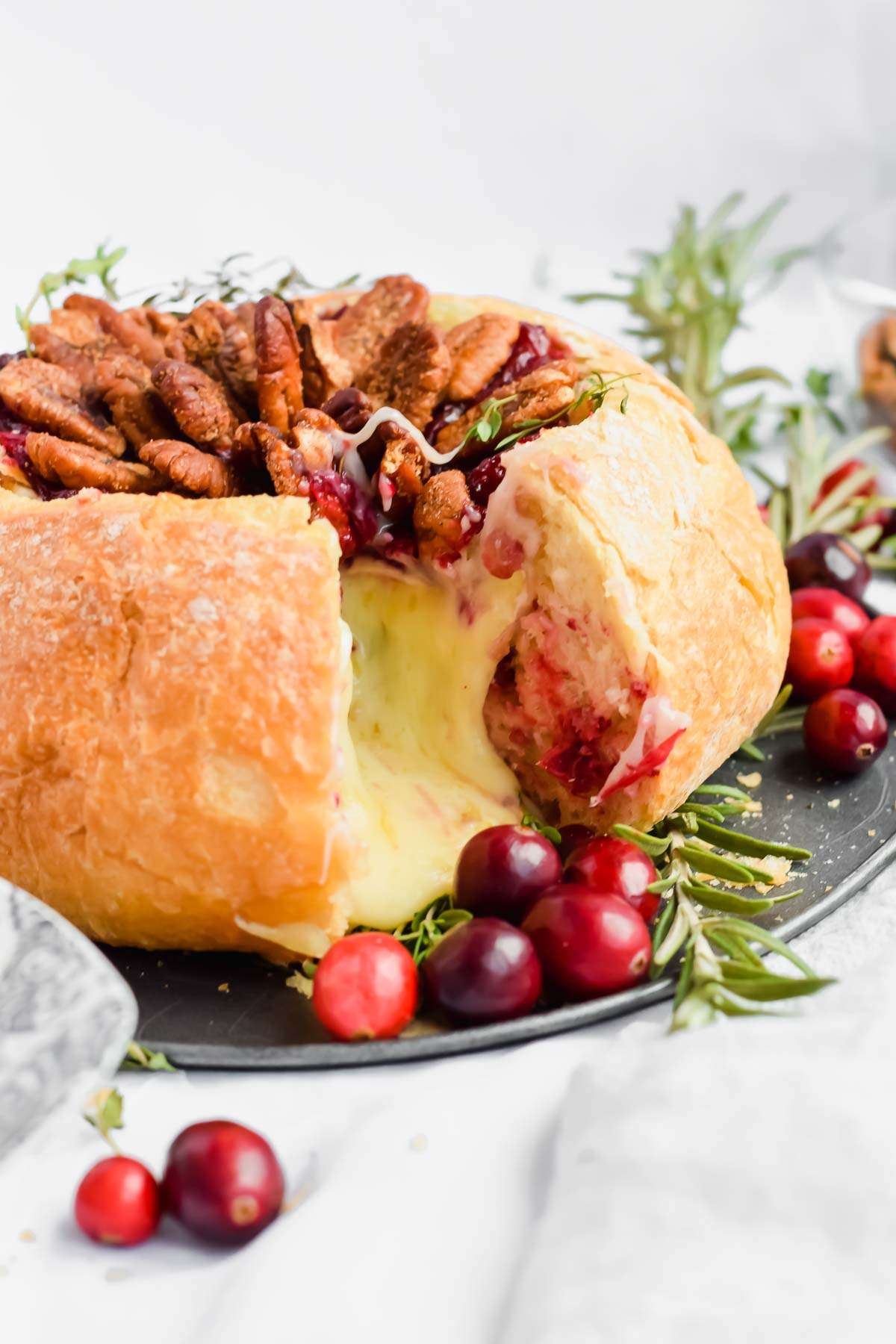 Get ready to impress on Thanksgiving with this Cranberry Brie Bread Bowl recipe. The warm bread stuffed with homemade, tart cranberry sauce, melty brie cheese, and sweet and crunchy pecans will go so fast and everyone will be begging for more!