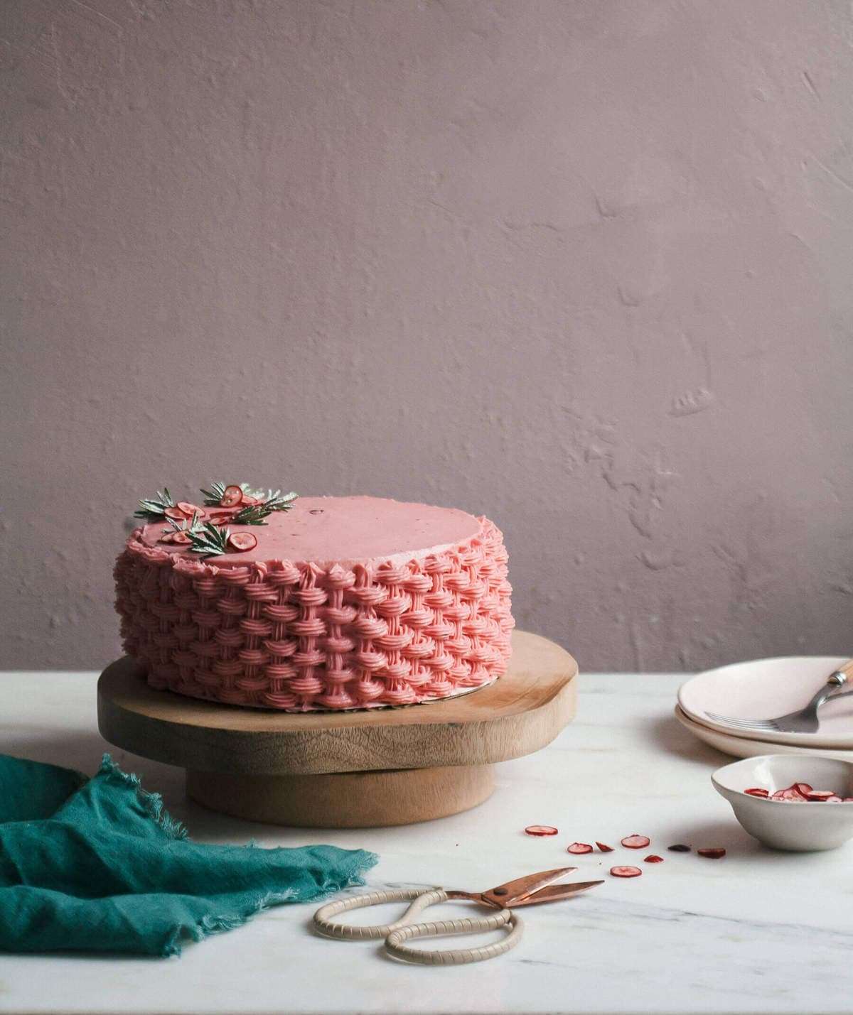 - To assemble: place the first layer of cake on a cake board or a cake stand. Add about 1/4 cup of frosting the top of the cake layer and smooth it out, pushing it out to the sides. Add the second layer on top and then add a second 1/4 cup to the top of that. (These measurements can be eyeballed.) Smooth out the top and add a nice thin layer all the way around the sides of the cake. Transfer to the freezer to chill for about 5 to 7 minutes. This is the crumb coat. Add a second even layer on the outside. I used a small star-tip to create an over under, over under effect. I topped it with sliced cranberries and rosemary that were dusted with powdered sugar. Slice and serve!