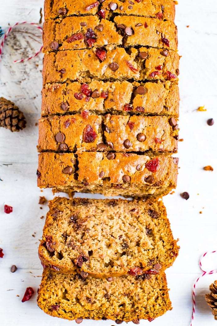 This cranberry chocolate chip bread is sweetened with bananas and studded with dried cranberries and chocolate chips.