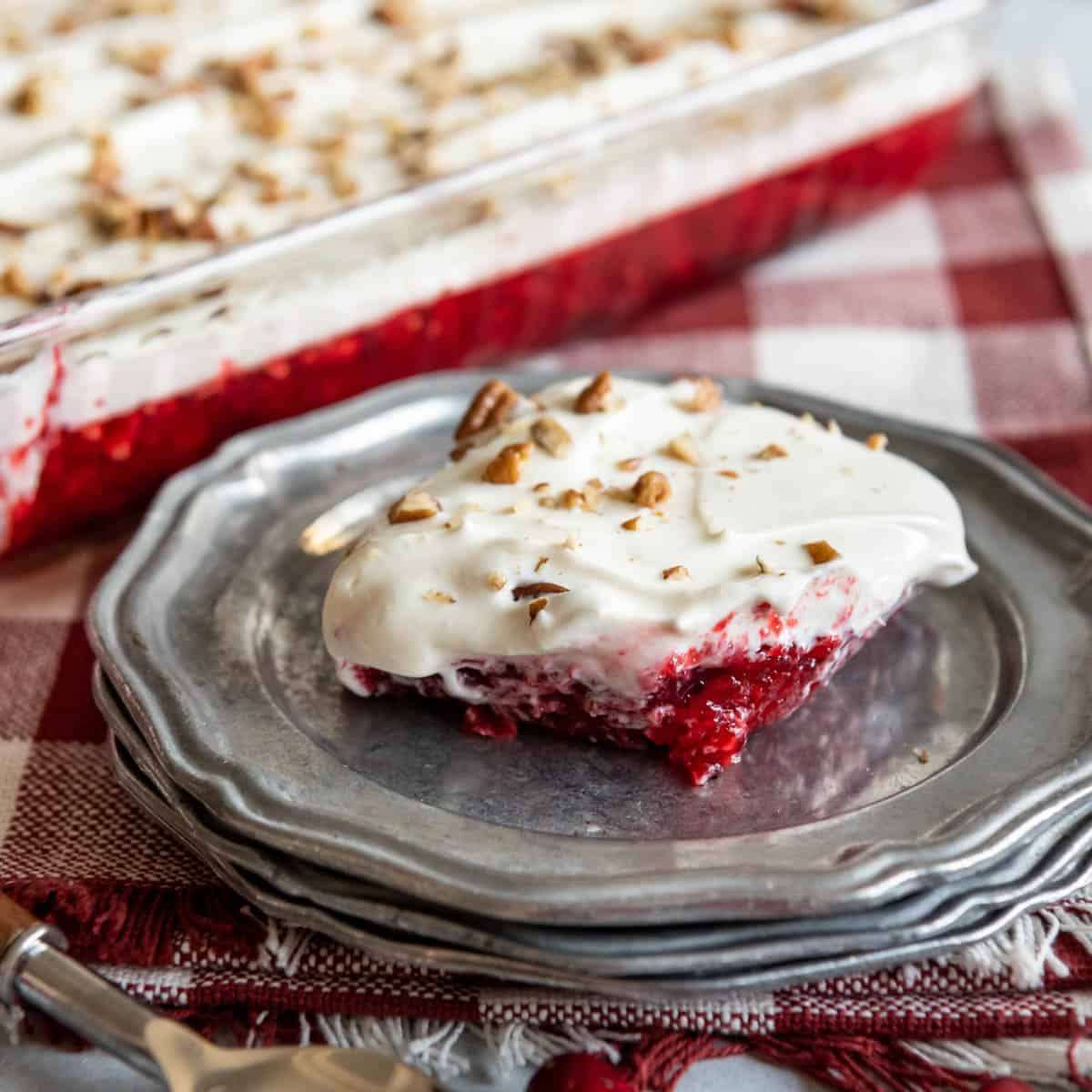 Cranberry Jello Salad is a sweet-tart, dessert salad loaded with crushed pineapple, chopped pecans, cranberries and a tangy cream cheese topping! It's perfect to serve for Thanksgiving dinner, Christmas dinner, or any night of the year!