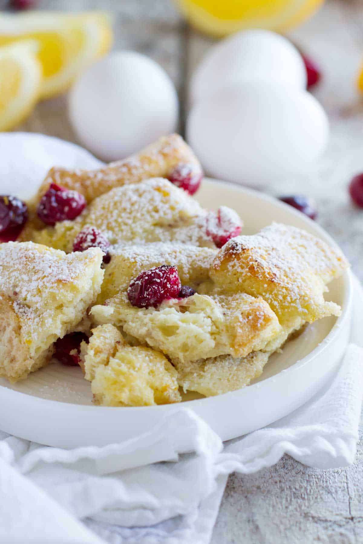 This Cranberry Orange Baked French Toast Casserole is an overnight breakfast casserole that is filled with fresh cranberries and fresh orange. It is perfect for holiday mornings.