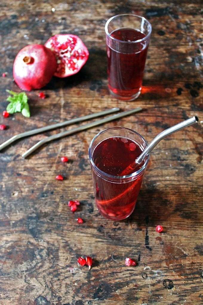 - Add all ingredients, except the pomegranate seeds, to a cocktail shaker and shake well. Strain into a glass and serve with the pomegranate seeds floating in the glass (they will slowly sink).