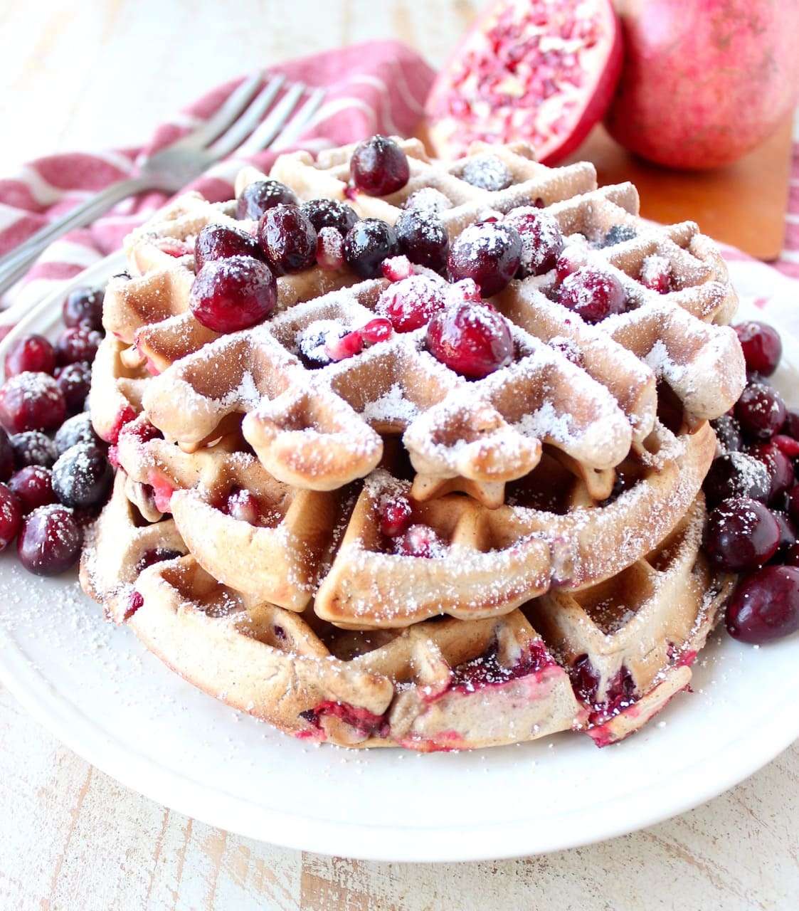 Fresh cranberries & pomegranates add a delicious burst of tartness & sweetness to this easy waffles recipe, perfect for fall breakfast or holiday brunch!