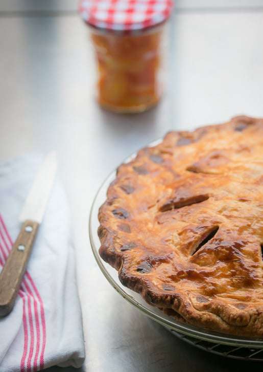 Adapted from The Fannie Farmer Cookbook by Marion Cunningham, pie dough from Ready for Dessert I’ve been on the fence about rolling pastry on a lightly floured countertop versus between two sheets of parchment. Here, the parchment won out. If you choose to go that route, rather than rolling it out the traditional way, make sure the dough comes back to close to room temperature before rolling it out. I find it helps to unwrap the dough, then hold the disk so it’s perpendicular to the counter, and rap it on the counter, turning it as you go. That helps soften just the edges of the dough, and prevents them from cracking when you roll it out. The orange liqueur is pretty important for the taste, but you could use Cognac or brandy. If you’re avoiding liquor, fresh orange juice would work in its place.