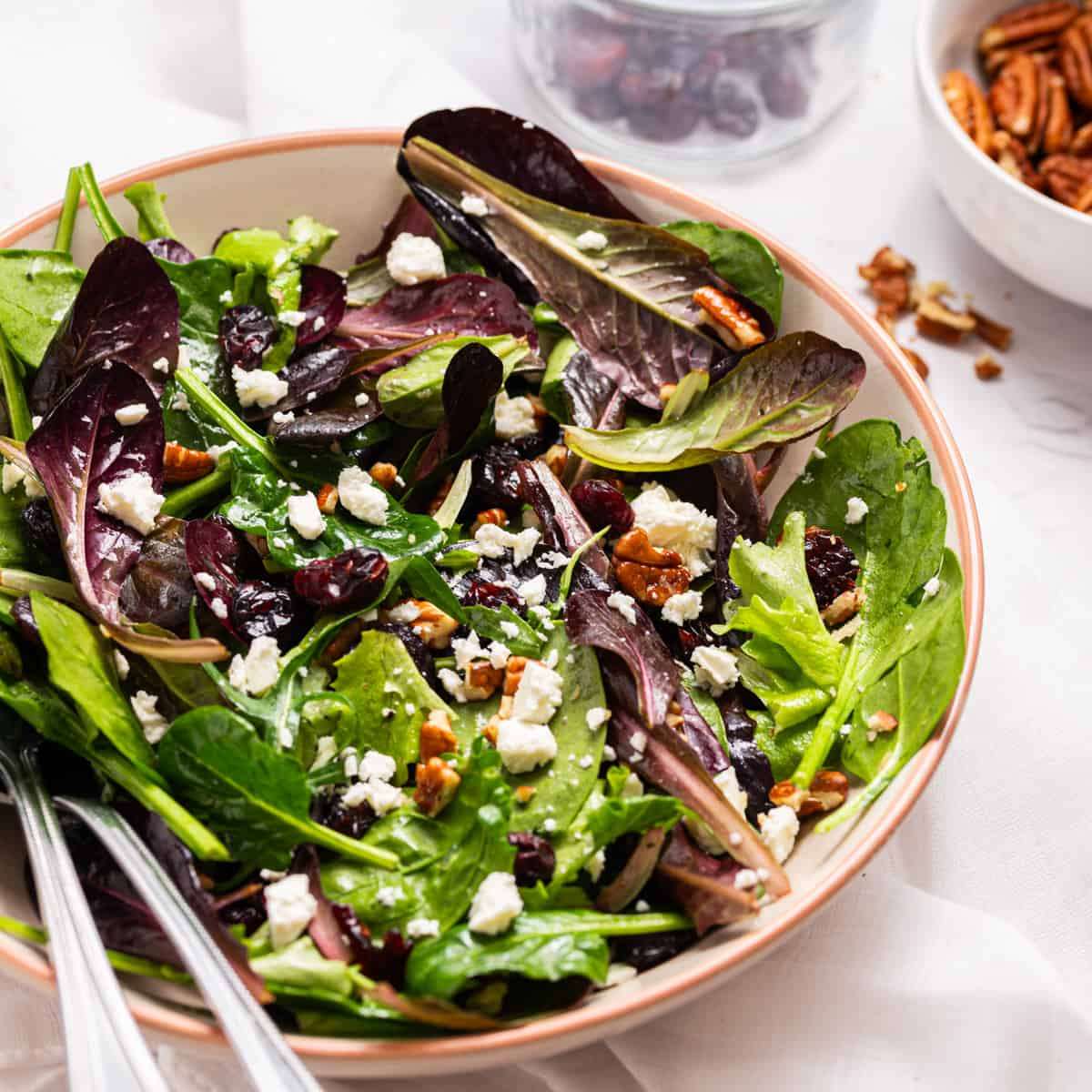This cranberry pecan salad is protein-packed. Tangy goat cheese, sweet cranberries, crunchy pecans and a zesty dressing + ready in 10 minutes!