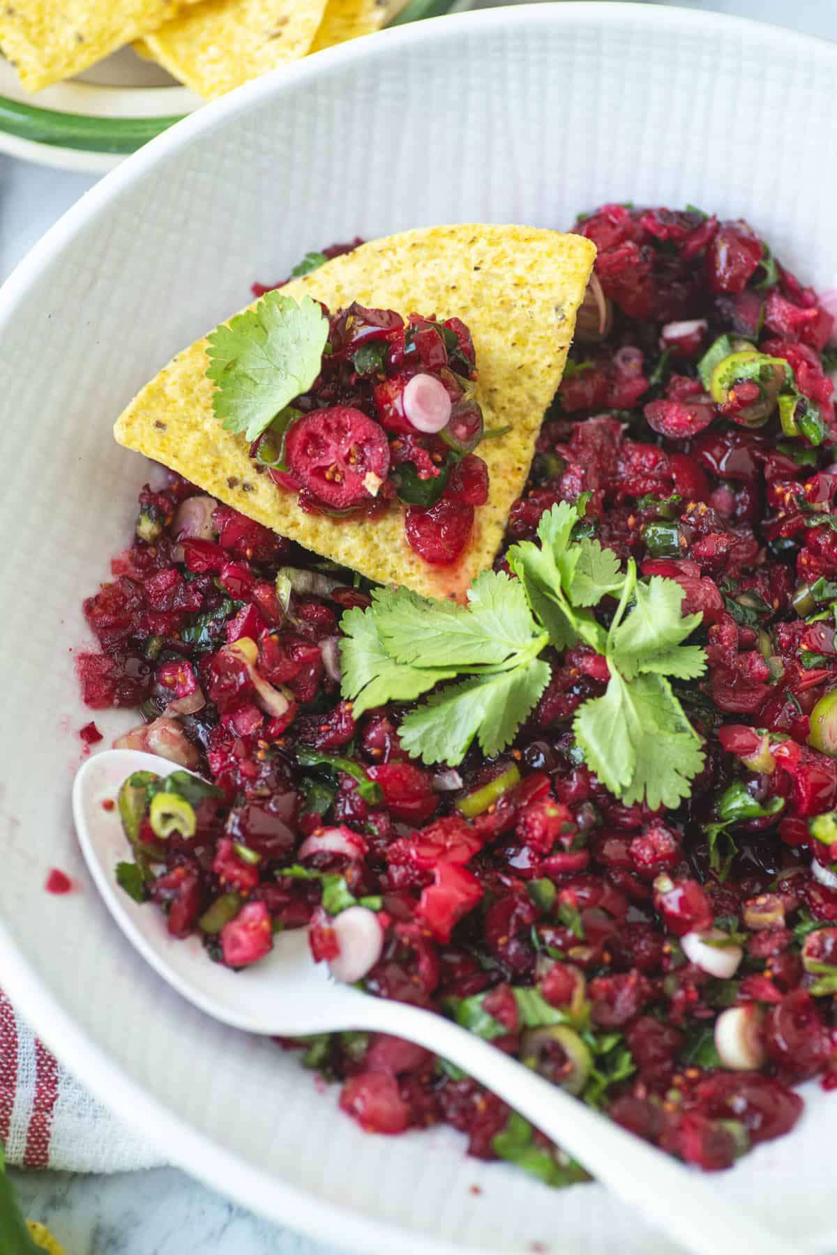 This Cranberry Salsa turns the classic spicy condiment upside-down with a fruity twist!