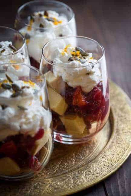 These Cranberry Orange Trifles combine all the flavors of a sweet, tart cranberry relish into an irresistible layered dessert topped with whipped cream and maple roasted pumpkin seeds.