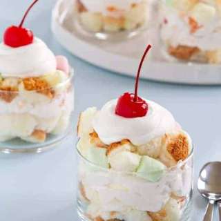 - Add a layer of pound cake cubes to the bottom of 4 glasses.