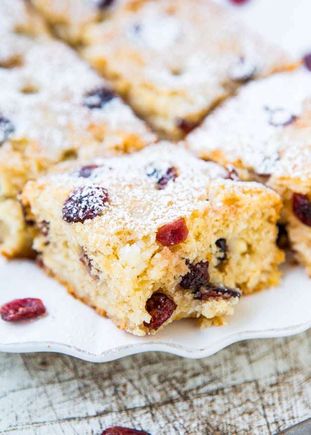 This fast, easy, no-mixer cake is light, soft, fluffy, and moist. It’s springy and bouncey, with just enough density to give it some heft and dimension. The flavors reminds me of Starbucks Cranberry Bliss Bars, which I love. The tartness of the dried cranberries, coupled with their chewiness, are great little surprises to bite into amidst the tender cake crumb. The white chocolate chips add another burst of texture, while providing a pop of sweetness, in the way that only white chocolate can do. I provided tips for two alternate buttermilk options in the body of the blog post.