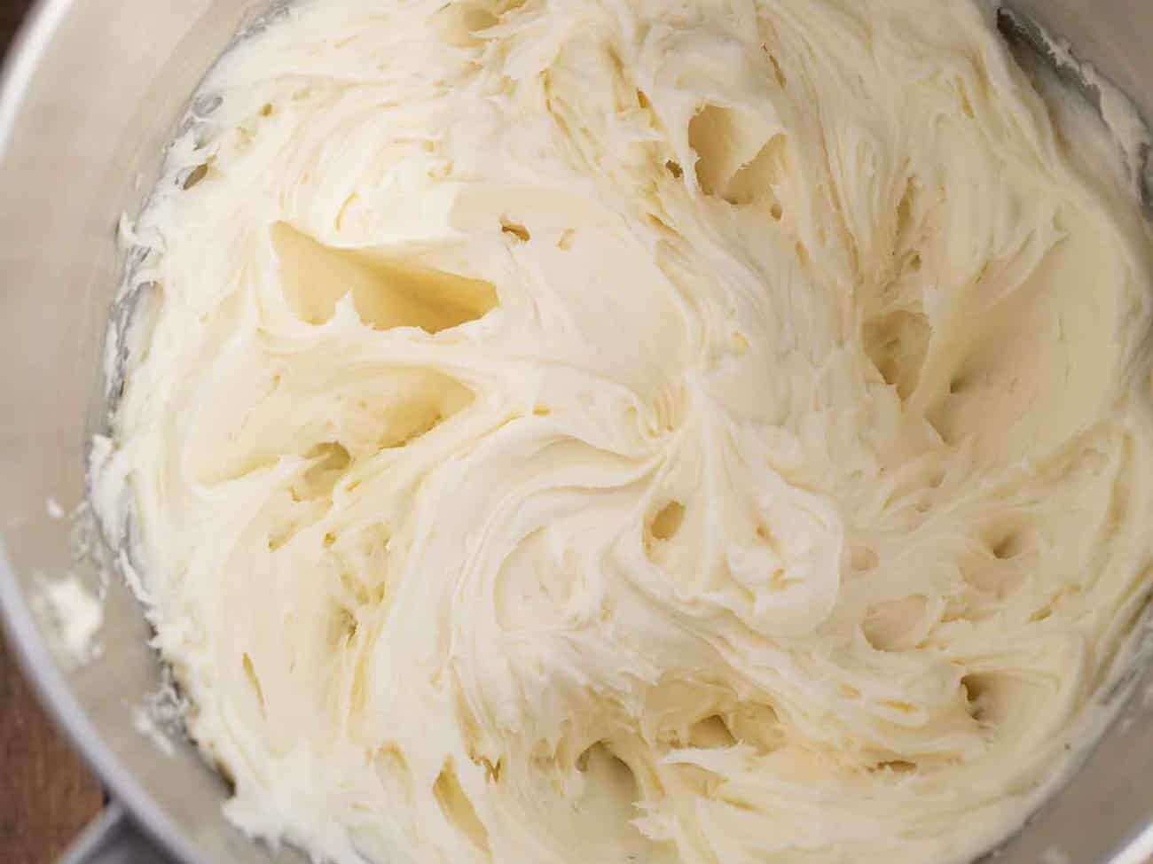- Add the cream cheese, butter, sour cream and vanilla to a stand mixer and beat until light and fluffy.