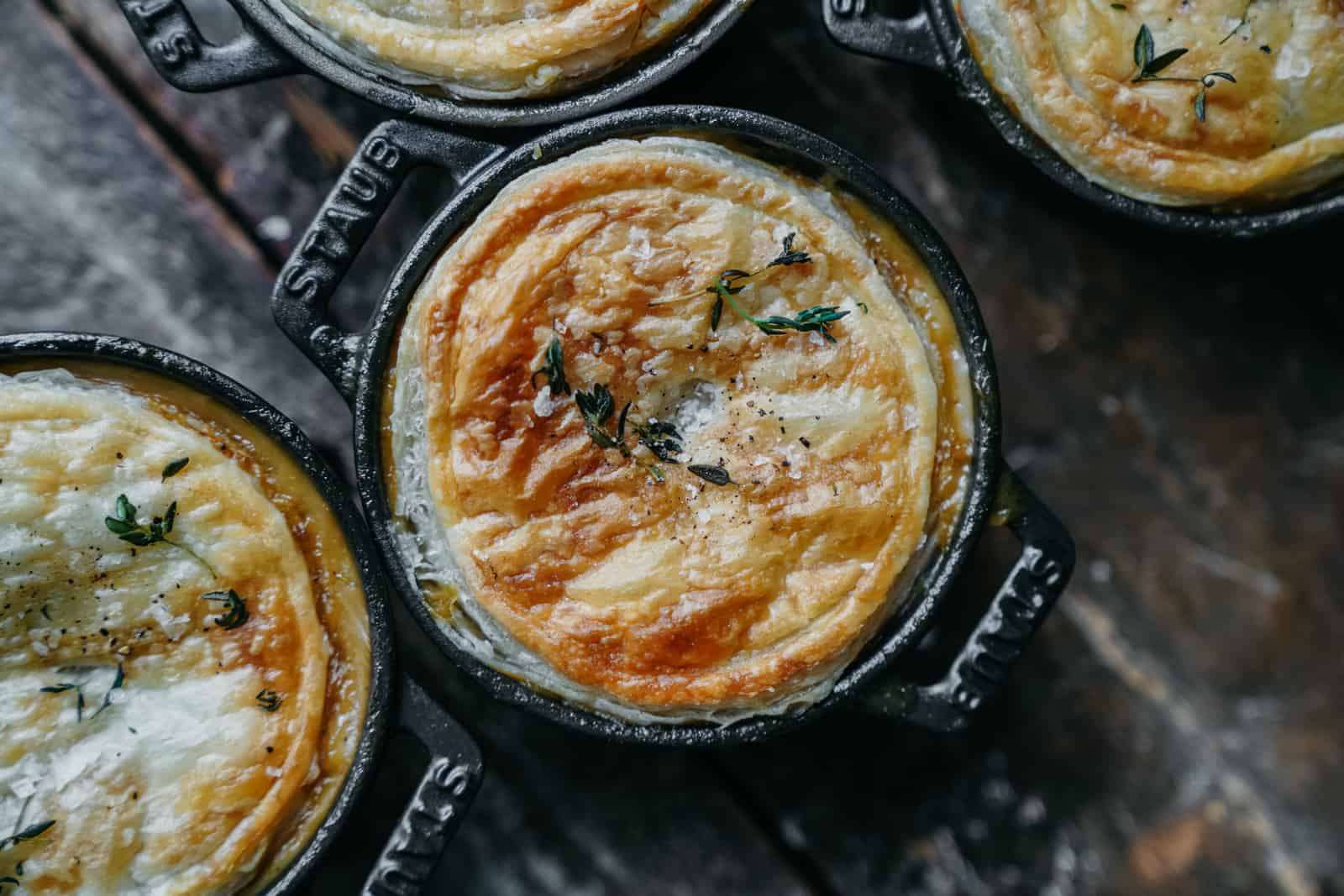 - Gently place the base puff pastry to the bottom of your pot, fill with your mushroom mixture and place the top puffed pastry onto the soup. Repeat for all four soup pots. Before placing in the oven lightly brush the tops with some olive oil or melted butter. Bake for around 10 minutes at 425F then finish on broil for 5 minutes to give the pies a very golden and rustic feel.