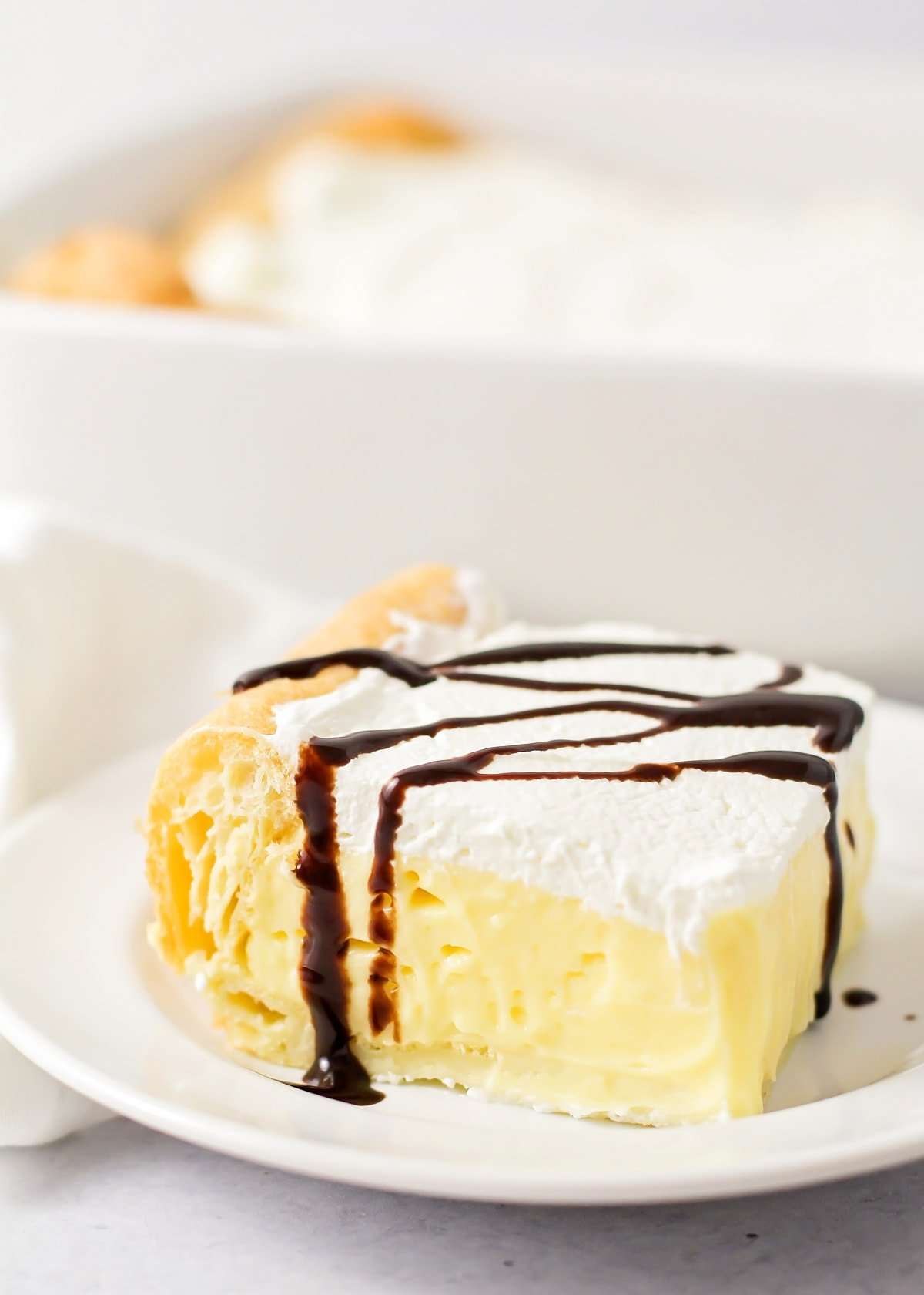 Smooth + rich Cream Puff Cake is a take on the popular cream puff dessert. Drizzle it in chocolate for a perfect bite!