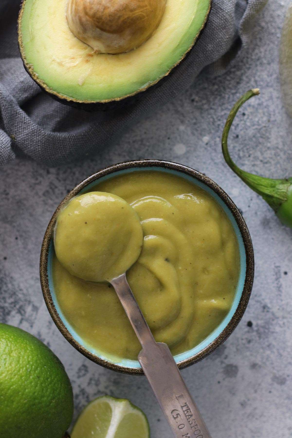 - In a cup of a (mini) food processor add the avocado, water, olive oil, lime juice, jalapeno, chili powder, garlic powder or a peeled clove of garlic, cumin, salt and pepper.