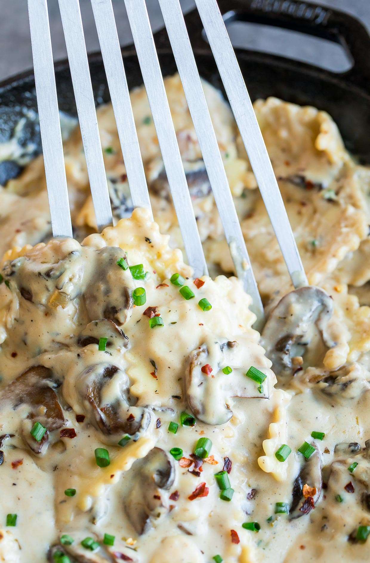- Once your sauce has reached desired thickness, fold in your seasoned balsamic mushrooms and cooked ravioli. Thin sauce if desired with additional milk and adjust seasoning to taste. Dive in while it's hot!