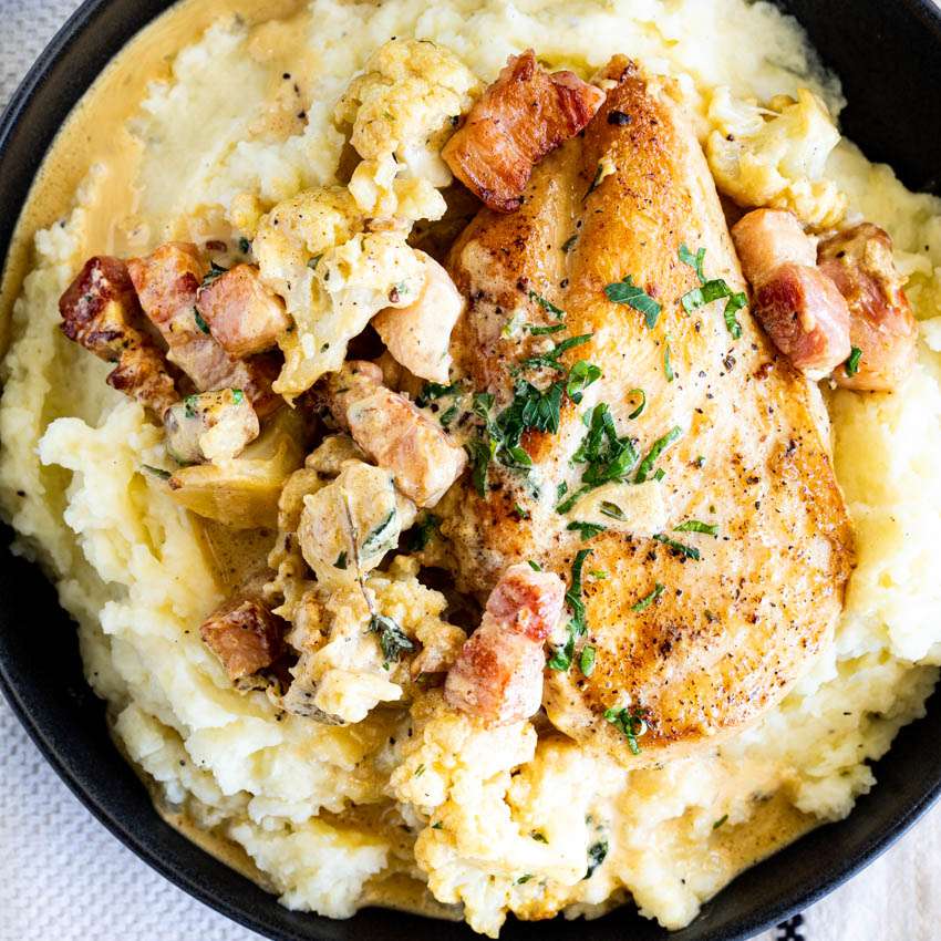 Creamy cauliflower chicken with chunky bacon lardons is an easy comfort food dinner. Delicious served with creamy mash to soak up the sauce.