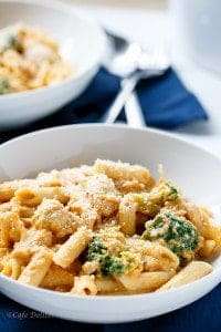 A creamy and healthier alfredo sauce made with pumpkin instead of flour, with tender chicken breast pieces and broccoli. Perfect with any pasta.